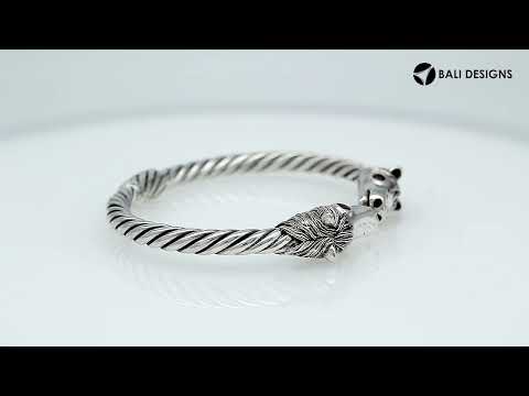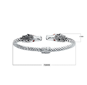 This handcrafted cuff Bangle features finely detailed Horse head motifs on each end, symbolizing strength and elegance. Made from solid Sterling Silver, the design is enhanced with deep Red Garnet Quartz accents for added character. The twisted rope band brings a bold yet timeless touch, making this an ideal wholesale piece for retailers seeking artisan-crafted jewelry with symbolic appeal.