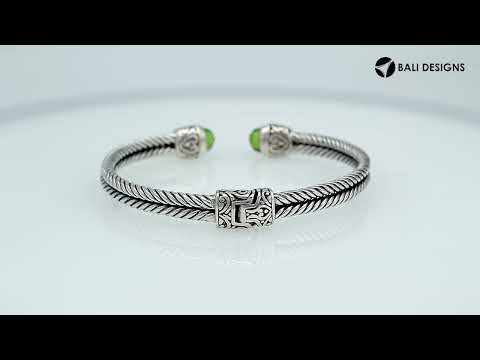 This wholesale Sterling Silver bangle features a twisted rope design adorned with bezel-set Peridot Quartz at the ends, accented by tiny Garnet Quartz inlays. The oxidized detailing and engraved Bali-inspired patterns enhance its handcrafted appeal. A versatile piece for bulk orders, combining brilliance with artisan silverwork.
