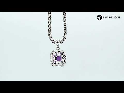This pendant highlights a cushion Amethyst Quartz held securely in an artistic prong-set frame enhanced with traditional Balinese carvings. Its refined proportions, polished contours, and consistent craftsmanship create a catalogue-ready piece ideal for wholesale assortments seeking dependable quality and classic decorative silver detailing.