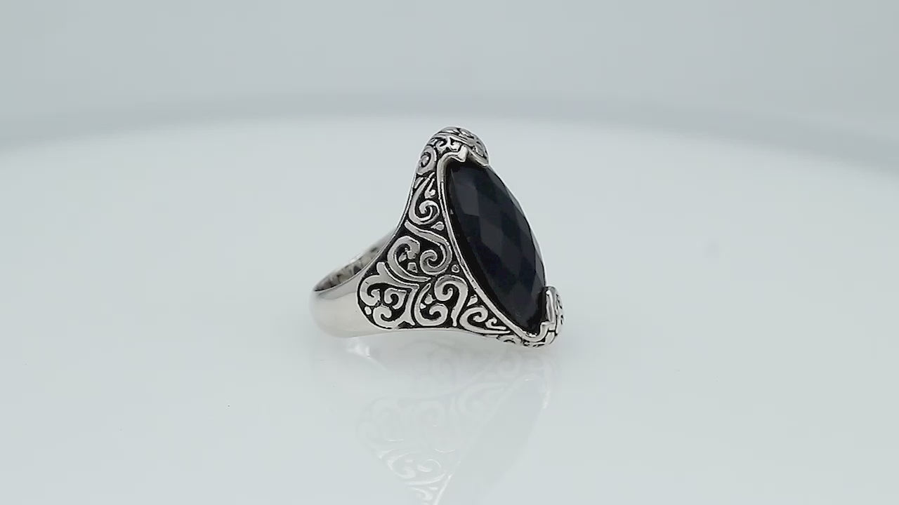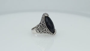 A bold handcrafted Sterling Silver ring featuring a faceted marquise-cut Black Onyx Stone set in intricate Balinese-style detailing. The oxidized silverwork enhances its striking contrast, offering a timeless fusion of elegance and craftsmanship—perfect for wholesale buyers seeking artisan-made statement jewelry.