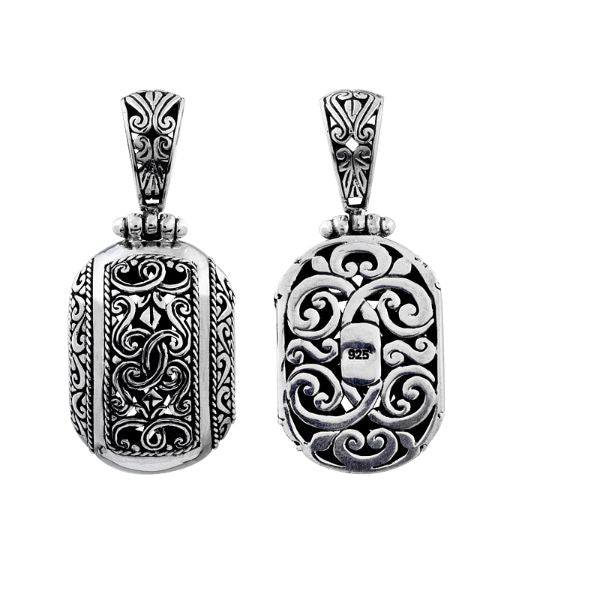 This handcrafted Sterling Silver pendant features an ornate, fancy oval design with intricate Balinese scrollwork. The oxidized finish enhances its depth and texture, highlighting the masterful artistry of Bali silversmiths....