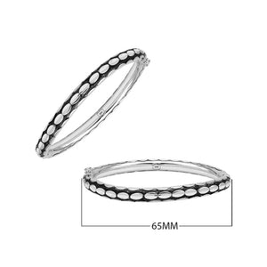 Made in 925 Sterling Silver, this medium-size bangle showcases bold oval textured detailing and a secure hinge lock with safety latch. Its polished and oxidized finish enhances durability, making it a strong wholesale option for curated modern silver jewelry collections.