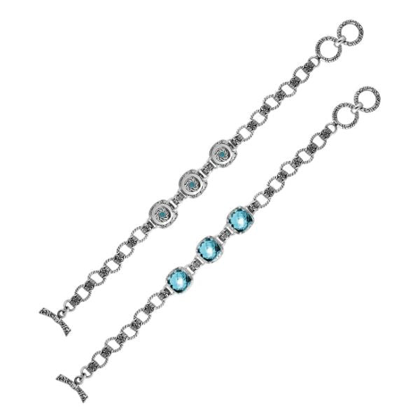 AB-6145-BT Sterling Silver Blue Topaz Quartz Triple Cushion Link Bracelet With Detailed Balinese Chain Elements And Elegant Handcrafted Artisan Design