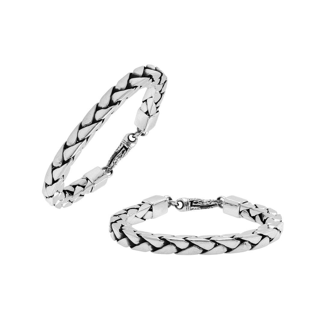 This 4MM sterling silver bracelet features a bold flat-weave chain crafted with polished and oxidized detailing. Its secure lobster lock adds strength and reliability, making it an excellent wholesale option for retailers seeking high-quality, handcrafted Balinese chain bracelets.