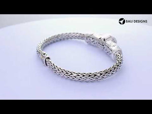 Made in Sterling Silver With 18K Gold, this bracelet features an oval diamond-accent centerpiece enriched with Balinese scroll patterns and gold dot detailing. Its woven chain and oxidized finish enhance artisan texture, ideal for wholesale catalog placement, Handcrafted In Bali, Indonesia.