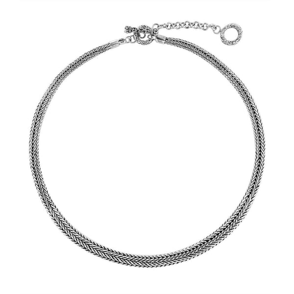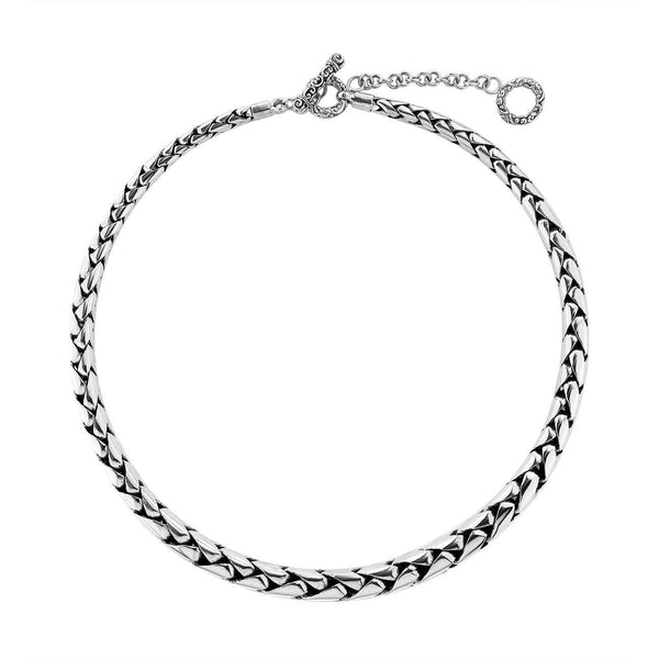 A bold wholesale necklace handcrafted in 925 Sterling Silver with a graduated Wheat chain design that widens toward the center. Featuring a polished-oxidized finish and adjustable toggle clasp, this necklace is a premium artisan piece ideal for wholesale jewelry collections.