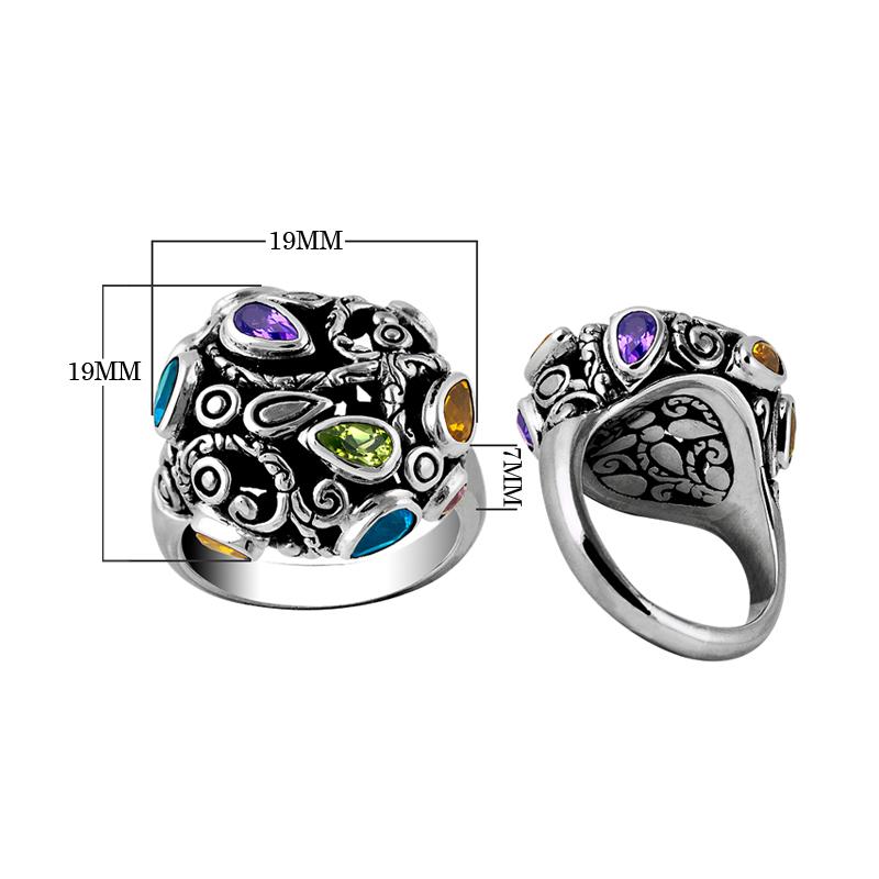 Enhance your wholesale jewelry collection with this stunning Sterling Silver handcrafted multi-quartz ring featuring Peridot Quartz, Citrine Quartz, Blue Topaz Quartz, and Amethyst Quartz. Meticulously designed by Balinese artisans, this bold dome-style ring showcases a cluster of teardrop-cut Quartz set within intricate silver scrollwork and oxidized detailing. The artistic blend of colors and textures captures the essence of Balinese craftsmanship, making it a perfect centerpiece for your Quartz jewelry line.