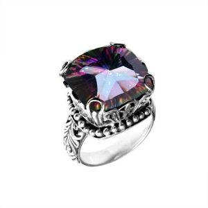 This wholesale ring features a luminous cushion-cut Green Amethyst Quartz set in 925 Sterling Silver. The prong-set stone is highlighted by bead accents and intricate filigree scrollwork along the band, showcasing traditional Balinese artistry. A bold design ideal for wholesale buyers seeking unique statement rings.