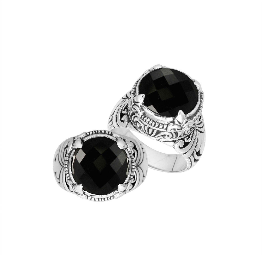 AR-8029-OX Sterling Silver Designer Round Shape Black Onyx Ring With Detailed Balinese Carving