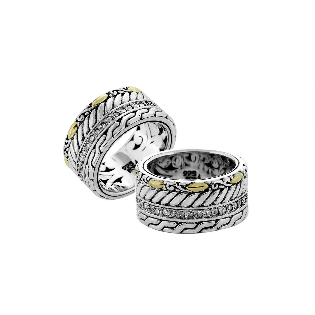 Crafted in Sterling Silver With 18K Gold, this wide-band ring features a Diamond-accent pavé center framed by braided rope patterns and golden teardrop motifs. Rich oxidized detailing highlights the multi-layered Balinese craftsmanship, creating a bold catalogue-ready design ideal for premium wholesale assortments.