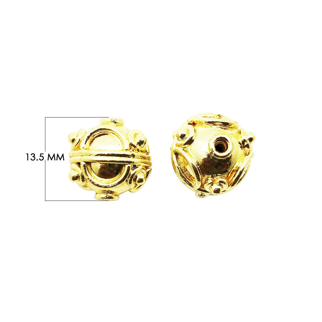 This handcrafted round filigree bead is made with high-quality 18K Gold Overlay over Copper, offering a premium finish suitable for professional jewelry production. Each bead is meticulously crafted in India, featuring ornate detailing that enhances the aesthetic of necklaces, bracelets, anklets, and earring designs. Ideal for bulk buyers seeking consistent quality and artisan workmanship.